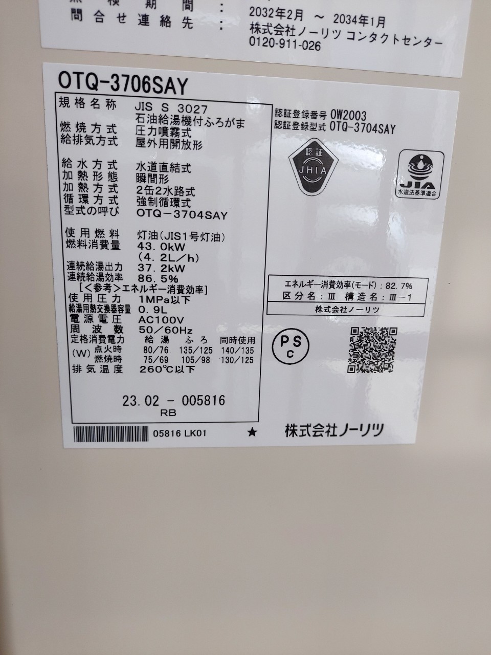 須坂市 ノーリツ給湯器OTQ-401AY→ノーリツ石油給湯機付ふろがまOTQ-3706SAY 給湯器交換工事