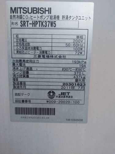 飯田市上郷黒田 三菱電機自然冷媒CO2ヒートポンプ給湯機 貯湯タンクユニットSRT-HPTK37W5→コロナ自然冷媒CO2家庭用ヒートポンプ給湯機ヒートポンプユニットCHP-DZ451K、貯湯ユニットCTU-37AZ1K…[続きを読む]